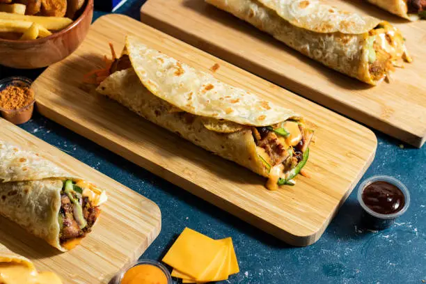 Tender shredded chicken rolled in pita bread with garlic mayo, pickles, and a drizzle of spicy sauce.